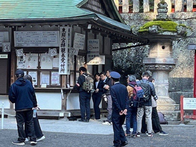 修学旅行のチケットを取るのは同行している添乗員さんです。輪王寺の駐車場から急いでチケット売り場まで走ってくれた添乗員さんとカメラマンさん。なんと先頭に並ぶことができました!つまり、他のどの団体よりも先に、鶴二小が入場できるということです。