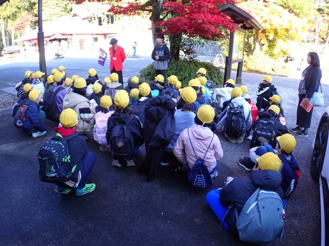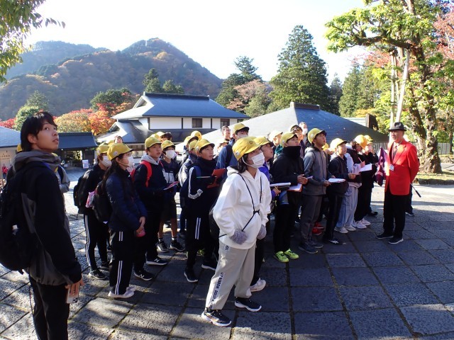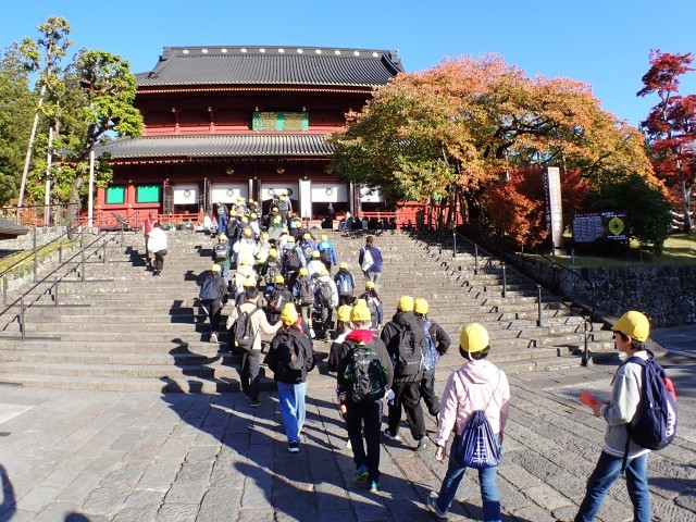 今年の修学旅行は、日光内のバスでの移動時間を少なくする(渋滞等を避けるため)ために、奥日光ではなく、日光に宿泊地を選びました。 そのかいもあってか、ほぼ1番で輪王寺の駐車場にバスが滑り込みました。 子どもたちと先生方が無事にバスから降りたことを確認すると、添乗員さんとカメラマンさんが、東照宮の方へ小走りで消えて行きました。 赤いジャケットと目印の帽子をかぶった「案内人さん」が笑顔で迎えてくださいました。 案内人になってから、30数年という、その道のプロです。 案内人さんの説明に、聴き入ってしまう子どもたちと先生方です。