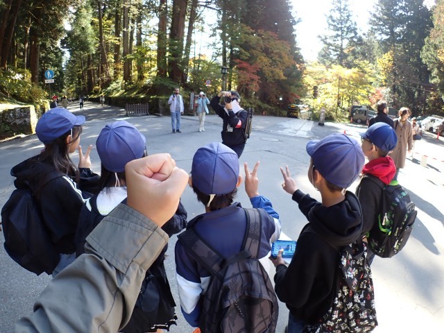 カメラマンさんと協力して、全ての行動班ごとの写真を撮影します。 「カメラマンさん。あと何班の撮影が残っていますか?」「校長先生。〇班と〇班です。」「ああ、〇班なら、あそこにいる班が〇班です。もう一つの班は、輪王寺方面からこちらに向かっていますよ。」 カメラマンさん。お疲れ様です。