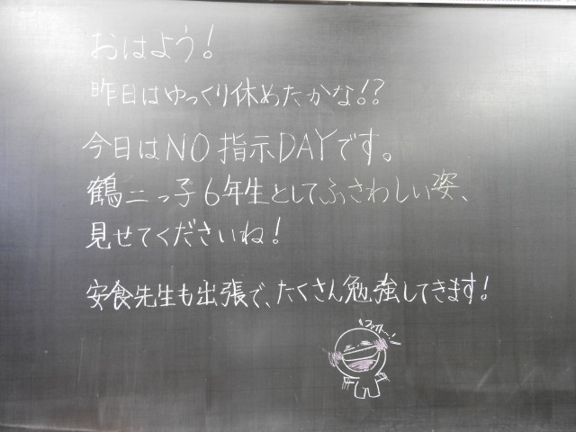 15日(金)の朝、毎日のように出勤すると、校長のモーニングルーティーンを実行しました。 出張に行くために、朝の登校見守りか戻ってらきてから、ホームページを更新しようと思っていたら、色々な方々から今後のミーティングの調整のお電話をいただき、気が付くと、出発の時間を迎えていました。 電車に乗ってから、「あっ! しまった! ホームページの更新ができなかった。」ということを思い出しました。 遠隔操作でやろうと思いましたが、撮影した画像データがありません。 ごめんなさい。と、毎日、鶴二小のホームページを楽しみにしてくださっている方々に謝りながら、出張会場へ向かいました。 遅れましたが、15日の朝の鶴二小からです。 初任者の先生が今日も子どもたちのために、黒板メッセージをしたためていました。毎日、コツコツ続けることの大切さを先生の行動から毎日教えていただいています。 修学旅行の引率に行った担任の先生も今日は研修出張のようです。「NO指示DAY」頑張れるかな? がんばれますよね。 ぐりどん広場の水路も順調に流れています。
