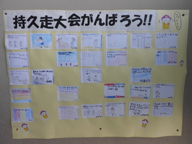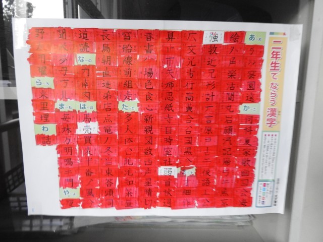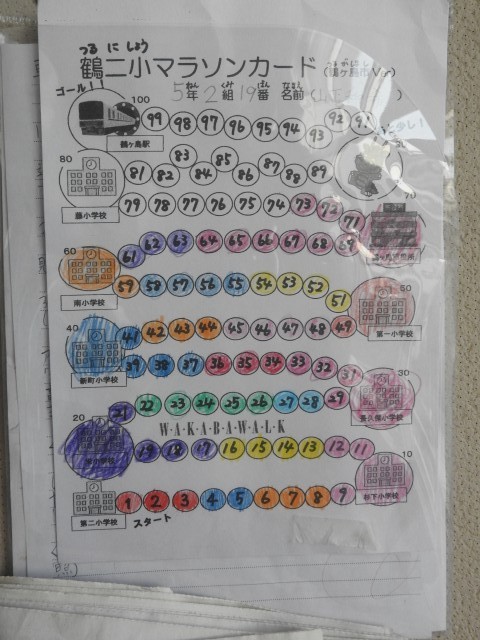 2年生の教室に掲示されている「二年生で習う漢字」の掲示物。残すところ、あと1回の授業で、すべての漢字の学習が終了するということを担任の先生から教えていただきました。 授業で学習した後に、子どもたちと先生が、一文字一文字、この表の漢字を塗りつぶしてきたそうです。 3年生の学年掲示板に持久走大会にかける子どもたちの想いが記されていました。 鶴二マラソンカードです。2枚目、3枚目……と自分のペースで、毎日、コツコツ積み上げています。 学校のあらゆる場面で、努力の見える化(可視化)の工夫がなされています。 幼い頃から、自分の一生懸命の努力が、見える化できる習慣を知ることの大切さを感じます。 継続は力なり。 継続した努力の積み重ねを可視化することが、やがては、自信につながり、実力アップに。