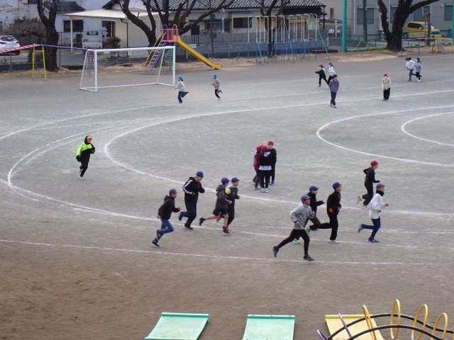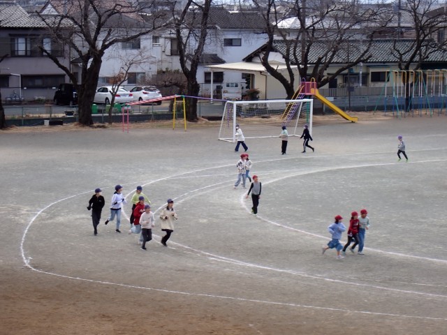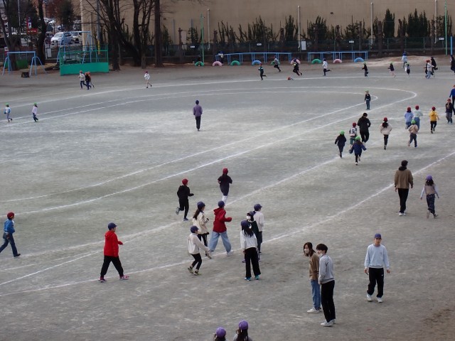 業間休みになりました。(業間休み:2時間目と3時間目の間の長い休み時間のことです。)子どもたちと先生が、持久走大会に向けて練習を、自分のペースで始めました。 鶴二小リーダー6年生たちの力強い走りを校長室から見守りました。 「おやっ? 何があったのでしょうか?」 コースの外の異変に気付いた6年生の女の子たちが走るのをやめました。