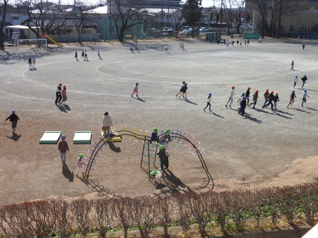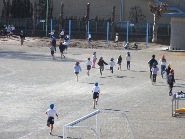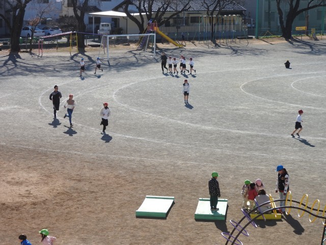 業間休みになりました。 子どもたちと先生方が、マイペースで持久走大会の練習を始めました。 働きものの教務主任の先生は授業や出張で、これまで走れなかった分を取り戻そうと、子どもたちと共に一生懸命走っていました。 「がんばれぇ!」小さなお客様たちも、一生懸命、応援してくれていました。