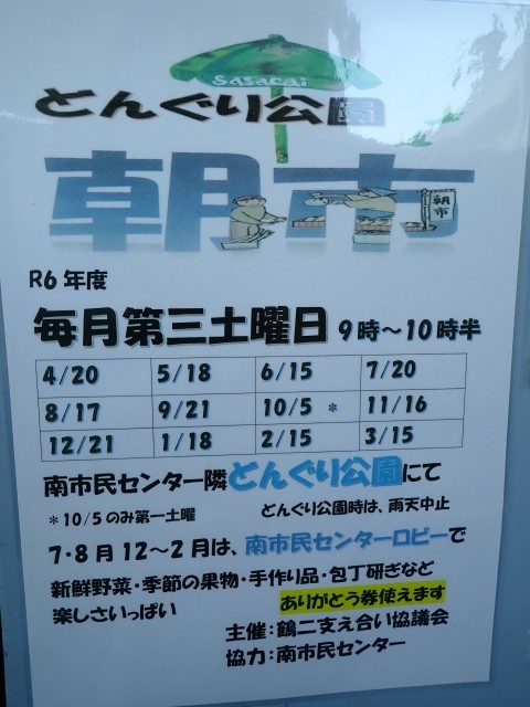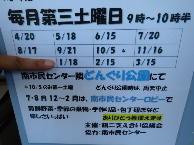 明日(18日)はどんぐり公園 朝市です! 鶴二小支え合い協議会さんからのお知らせです。