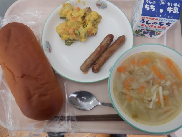 黒パン、ジュリエンヌスープ、ウインナーケチャップソースかけ、さつまいもとカボチャのサラダ、牛乳です。