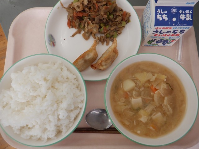 ごはん、具たくさんみそ汁、揚げ餃子、きんぴらご飯の具、牛乳です。