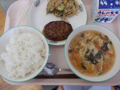 「ごはん、牛乳、かき玉汁、照焼きハンバーグ、ごぼうサラダ」です。