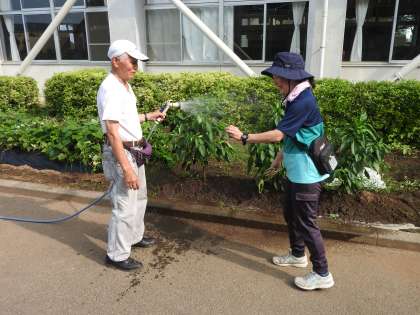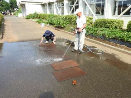 今日の鶴二っ子チャレンジは、ふだんできないことをやってみよう です。 毎年、夏休み第一日目の校長のルーティーンも三度目を迎えました。 ふだんできないことをやってみようと、北校舎のトイレマットを全て集めて、1階に運びました。 すると、鶴ヶ島のお父さん(学校応援団さん)と芸術センスぴか一の学級運営補助員の先生(アーティスト先生です。)が、菜園の水やりや野菜の収穫をしていました。 お花仙人の先生のお話では、ピーマンやナスは収穫した方が、新たな実が育つそうです。 お二人が、トイレマット洗いのお手伝いをしてくださいました。 夏休み中も、鶴二小のために美しい汗を流してくださり、ありがとうございます!