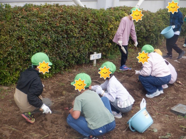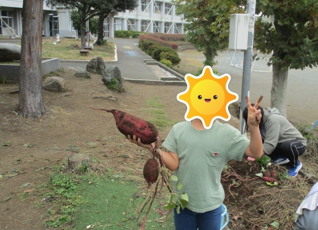 今年度、体育館前にもサツマイモを植えました。うまく育たないのでは?という予想もあったのですが、掘ってみると・・・何と何との大豊作です。子どもの顔より大きなイモがざっくざく。しかも鈴なりです。今までイモ...