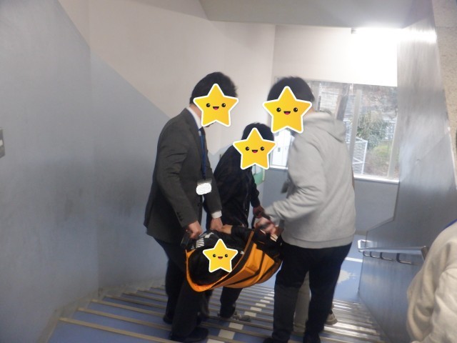 先日行った職員のミニ研修です。携帯用の担架を導入したので、その使い方を練習しました。実際に同僚を運んでいます。防災に対する設備の充実を少しずつ図っています。