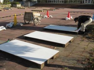 ています。校務員さんは、新しい「縄跳び板」を制作中ですし、体育