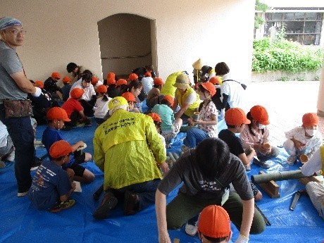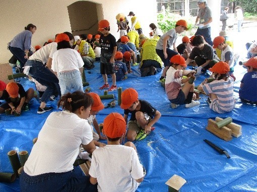 子どもたちは、そうめんを食べるためのお茶碗を竹で作っています。太い竹を一生懸命にのこぎりで切っています。