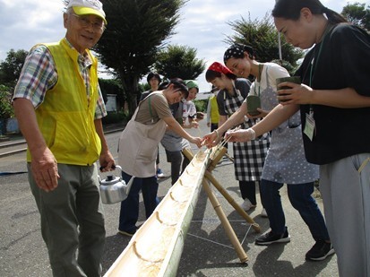 子どもたちは、流れてくそうめんを上手にすくい、めんつゆの入った竹のお椀に入れ、美味しそうにすすっています。