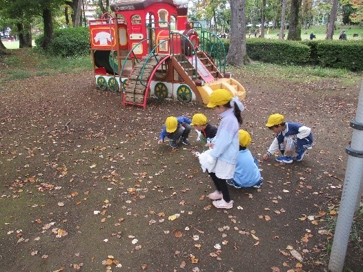子どもたちは、近隣公園に到着後、グループごとにドングリや松ぼっくり、落ち葉などを集めました。