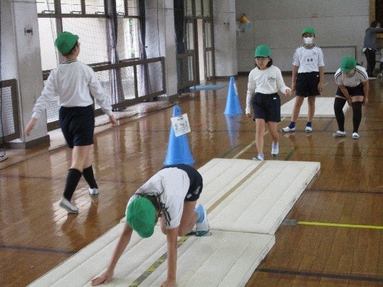 サーキット運動では、跳び箱運動の基礎的な技能の確実な定着を目指して取り組みます。