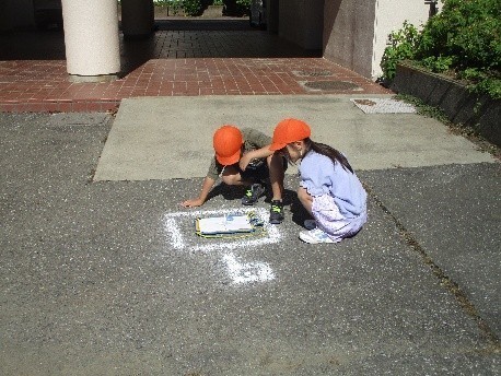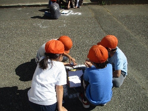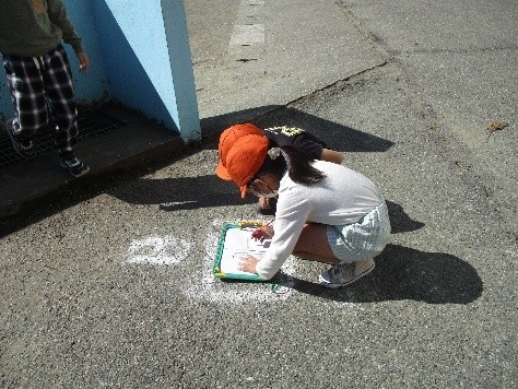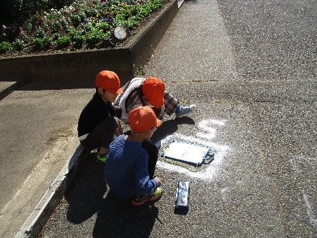 子どもたちは、方位磁石で方位を調べながら、かげの出来方について一生懸命に学習に取り組む姿が見られました。