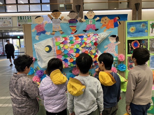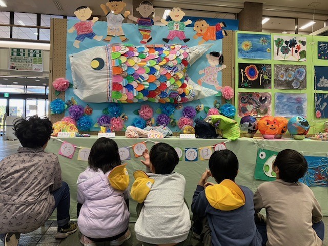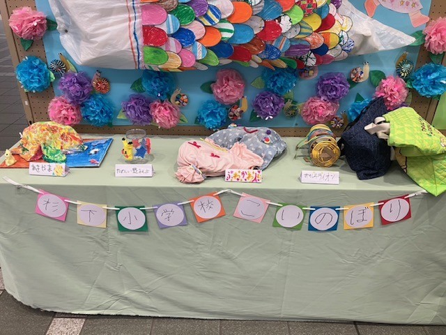 みんなで力を合わせ、こいのぼりやかたつむり、アジサイを作りました。また、テーブルの上には、一人一人が図工や家庭科で作った作品が展示してあります。