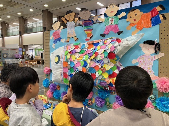 なかよし学級の子どもたちが一生懸命に制作した作品が、鶴ヶ島市役所のロビーに展示してあります。