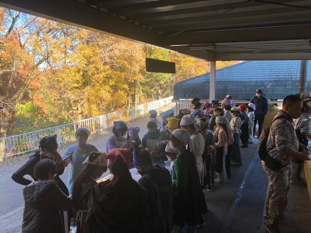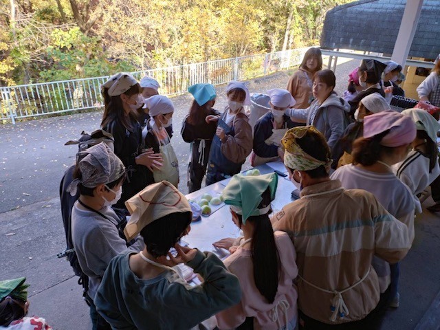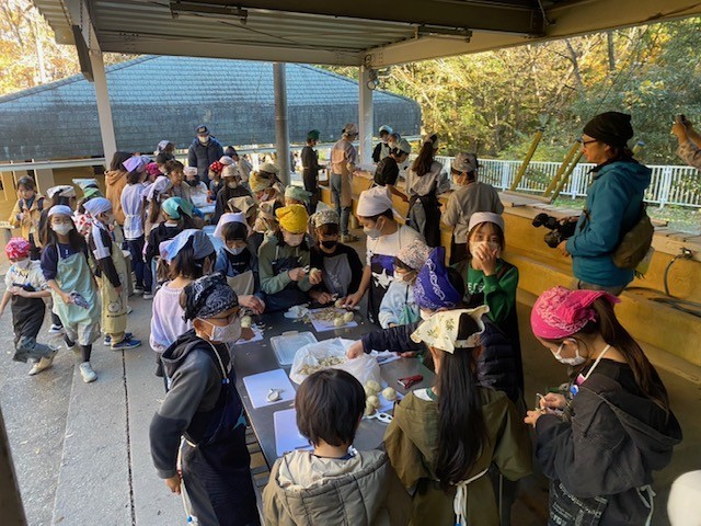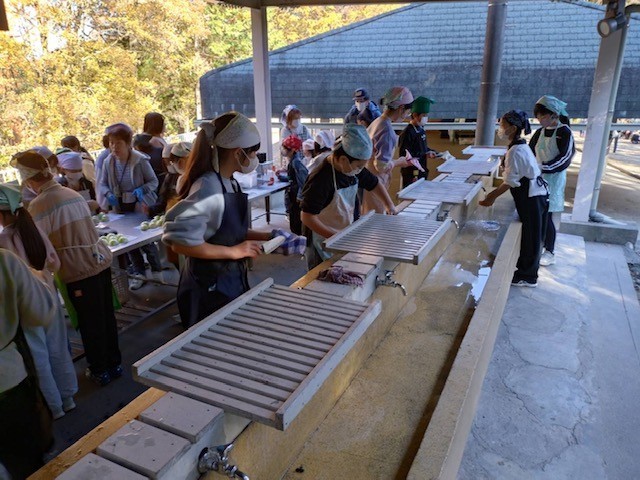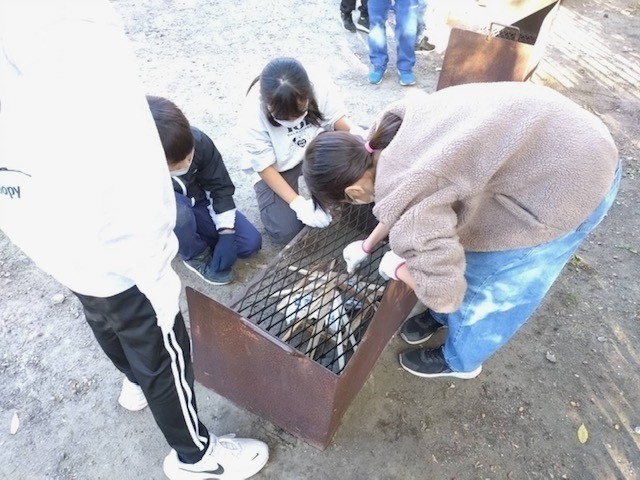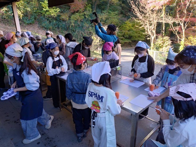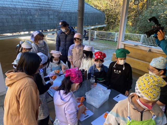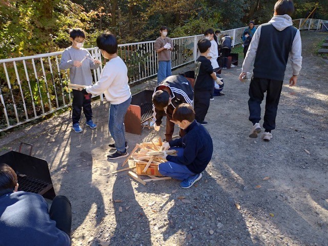 かまど班と調理班に分かれ、チームワークよくカレーを作ります。
