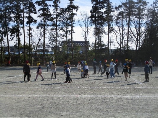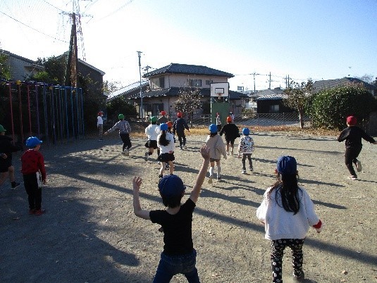 室内遊びグループは、ハンカチ落としやバケツたたき、何でもバスケットを、外遊びグループは、ドッヂボールやだるまさんが転んだ、鬼ごっこをして異学年との交流を楽しみました。