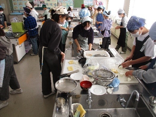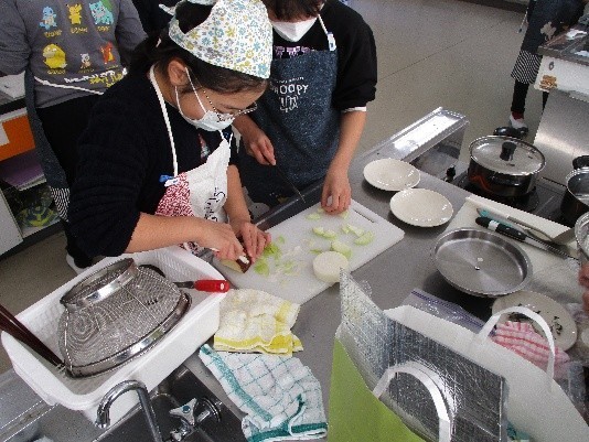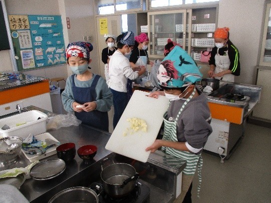 大根やサツマイモなど具材を慎重に包丁で切ります。油揚げやワカメなどグループによって具材が違います。