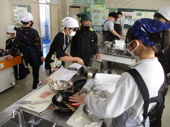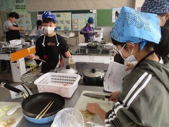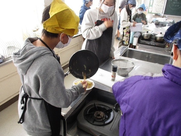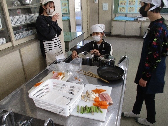 6年生の調理実習は、「ゆでる」「炒める」の学習です。今日は、グループごとにジャーマンポテトやベーコン巻きを作ります。
