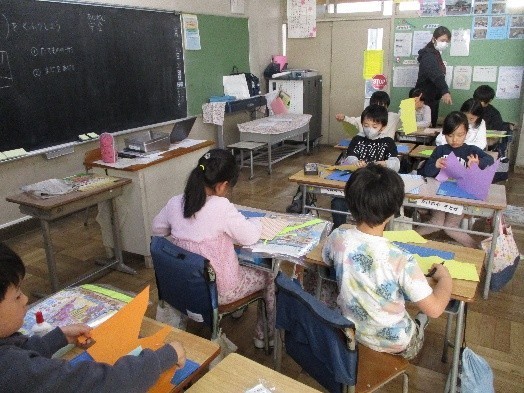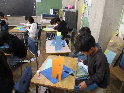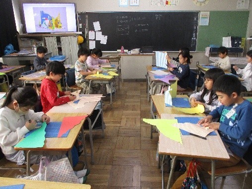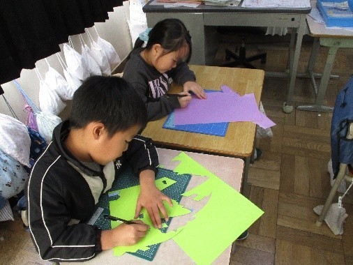 2年生の図工では、カッターを使って作品作りに取り組んでいます。