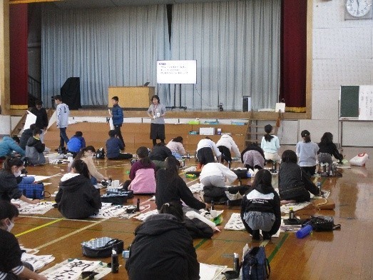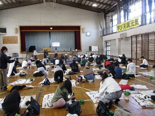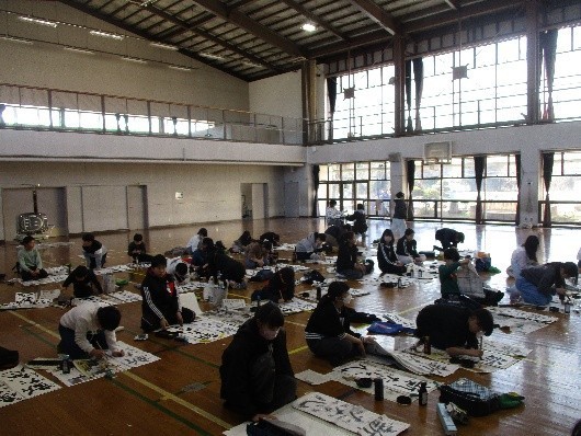 5年生の子どもたちも、初めての体育館での清書会に集中して取り組みました。