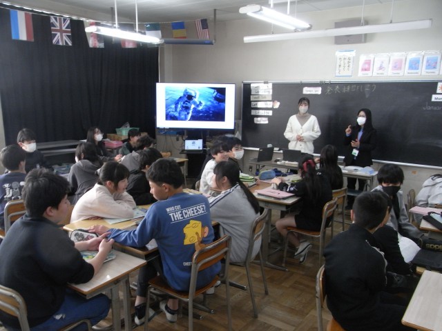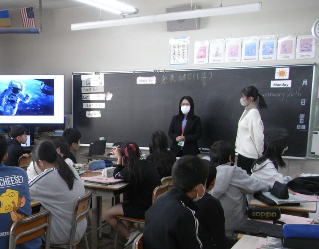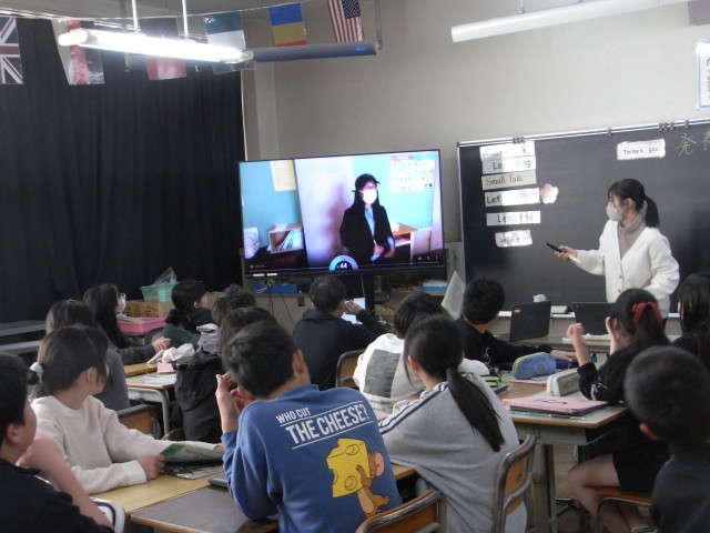 今日の授業では、英語での発表練習に取り組みました。子どもたちは、画面に映しだされたインタビュー映像を参考にしながら、グループの仲間とどのようにすれば伝わりやすい発表になるのかを話し合っていました。