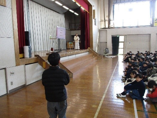 講演後には、各学年の代表児童からの質問、そして6年生からお礼の言葉と花束をプレゼントさせていただきました。