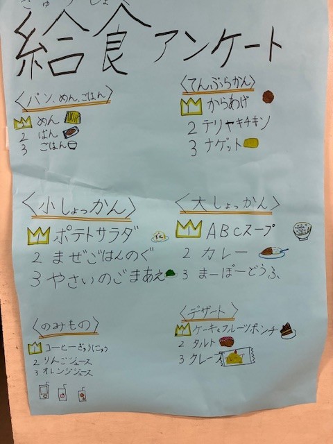 給食員会が実施した給食アンケートの結果が1階中央の廊下に掲示してあります。