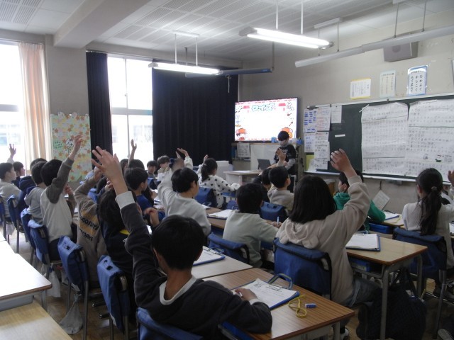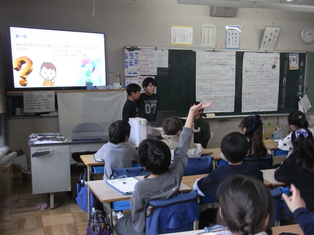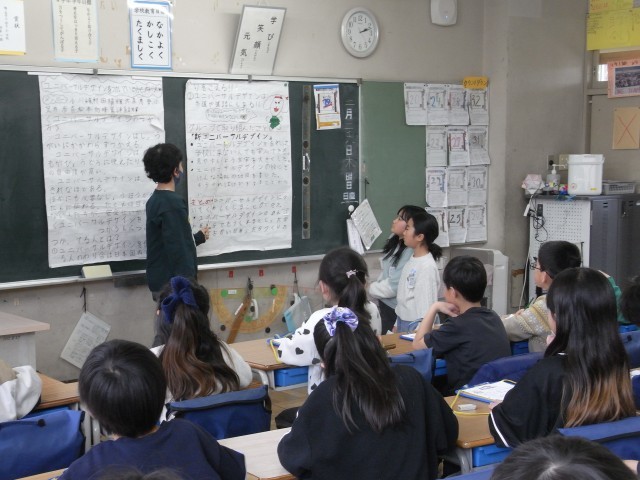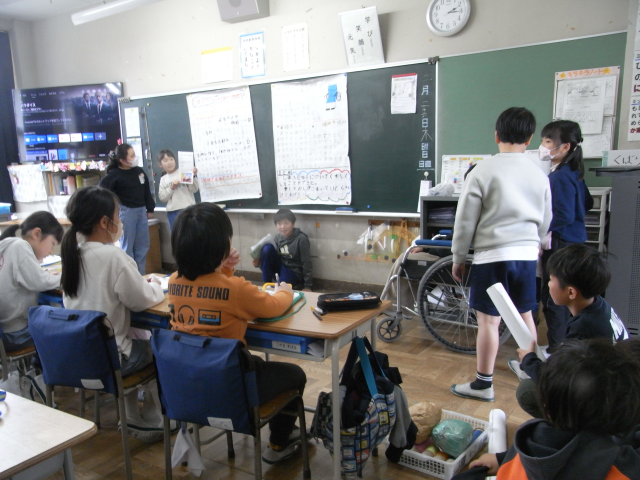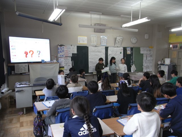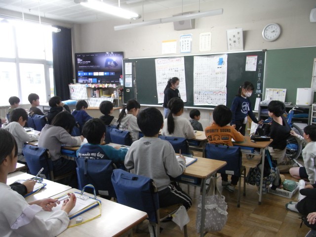 4年生はこれまで学んできた福祉について、3年生を教室に招いて発表しました。学びの中で気づいたことや、これから自分たちにできることなどを、わかりやすく丁寧に伝えようと発表していました。
