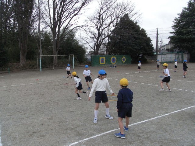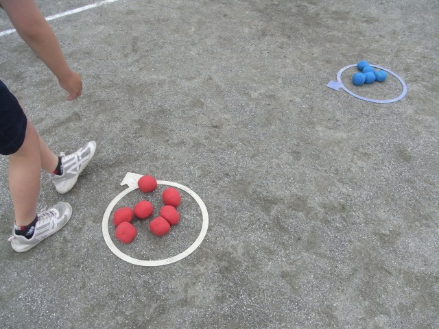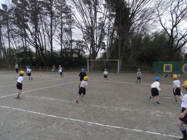 2年生の体育では、「鬼遊び」の学習をしています。赤チームと青チームに分かれて、宝物(色玉)を相手の選手にタッチされないようにしながら、ゴールまで運ぶゲームに挑戦しました。途中には安全地帯もあり、子どもたちは体を左右に大きく揺らしながら、素早く走ったり、タイミングを見計らって動き出したりと、工夫しながら楽しんでいました。