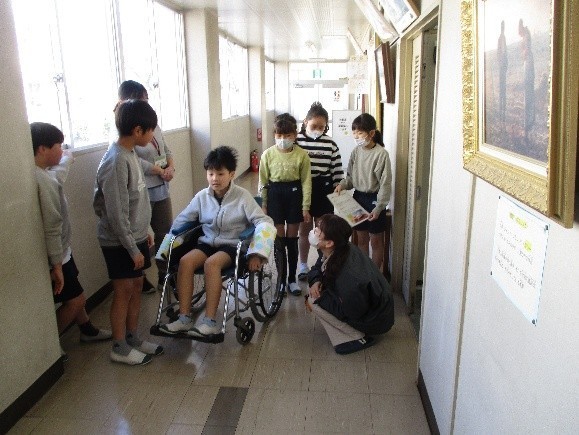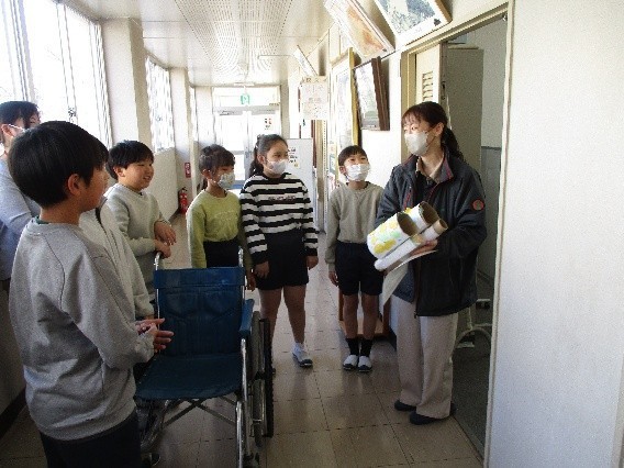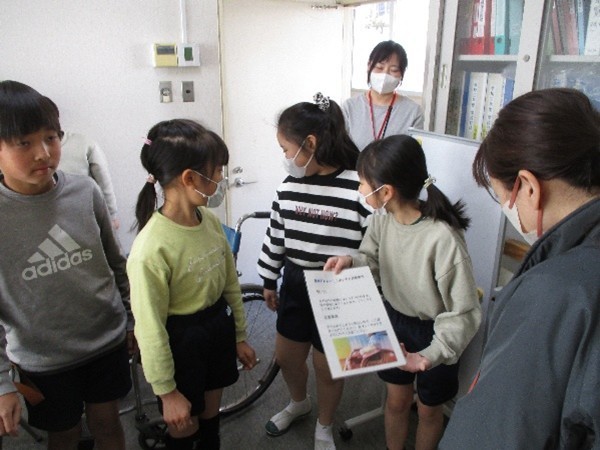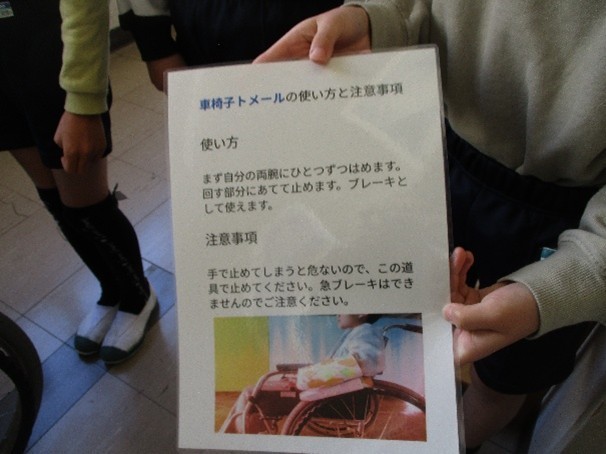 4年生は、総合的な学習の時間で福祉について学んできました。学習を進める中で、「今、自分たちにできることは何か」と考え、車いすを利用する方の役に立ててほしいという思いから、子どもたちは発明品をづくりに取り組みました。先日、この作品を社会福祉協議会の方にお渡ししたところ、大変喜んでいただけました。その様子を見て、子どもたちも満足そうな笑顔を見せていました。