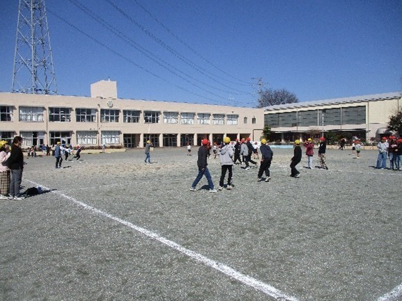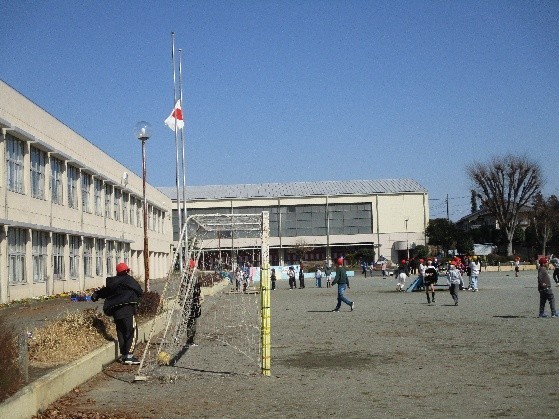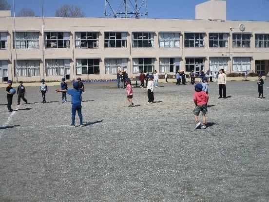給食終了のチャイムとともに、子どもたちが校庭に飛び出してきました。