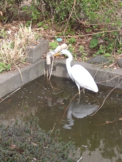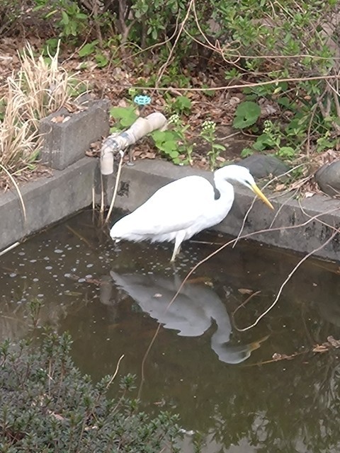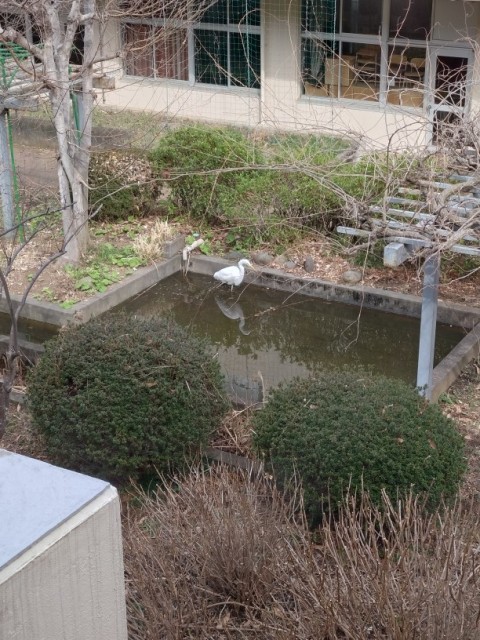 池に舞い降りた大きな白い鳥に思わず目を凝らすと、どうやらダイサギのようです。思いがけない来訪に、しばし見とれてしまいました。
