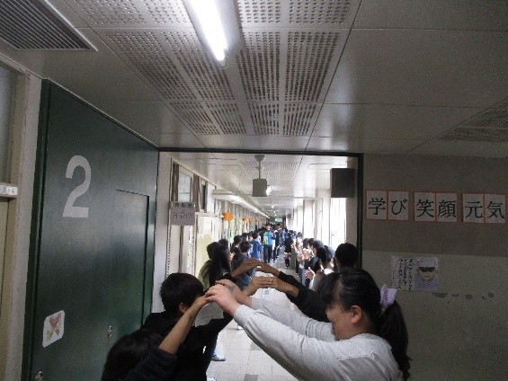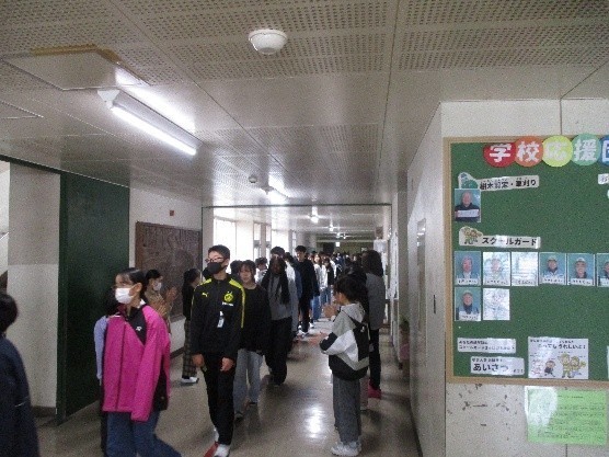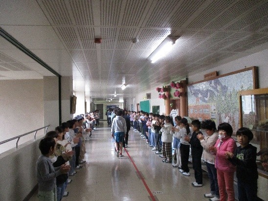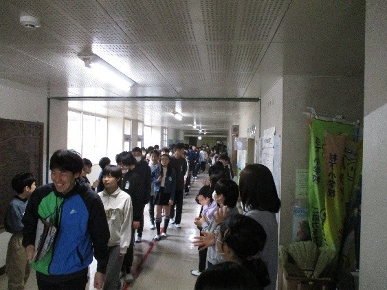 6年生の子どもたちは、廊下に並んだ在校生の間を嬉しそうに通過していました。