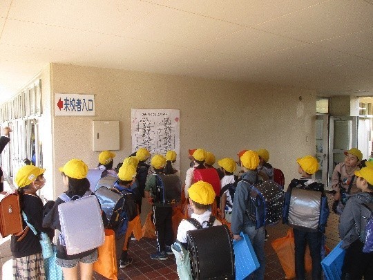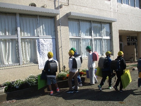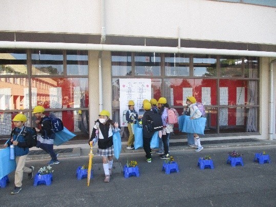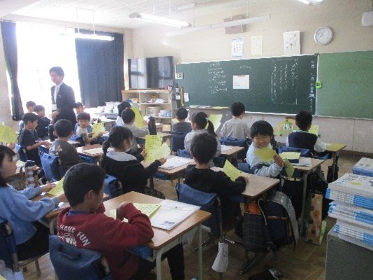 2~6年生の子どもたちが、元気に登校し、ワクワクしながら、クラス発表を見ています。