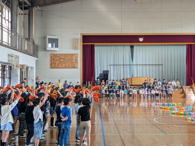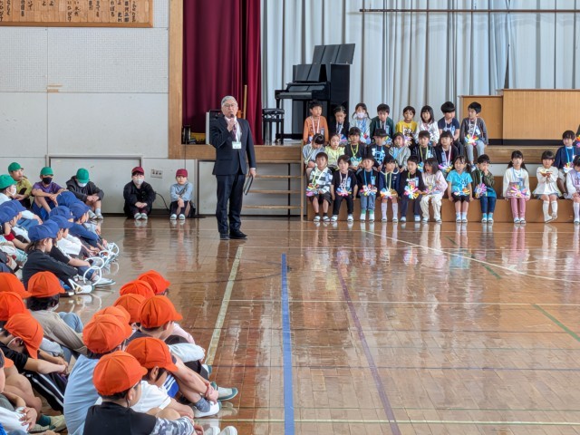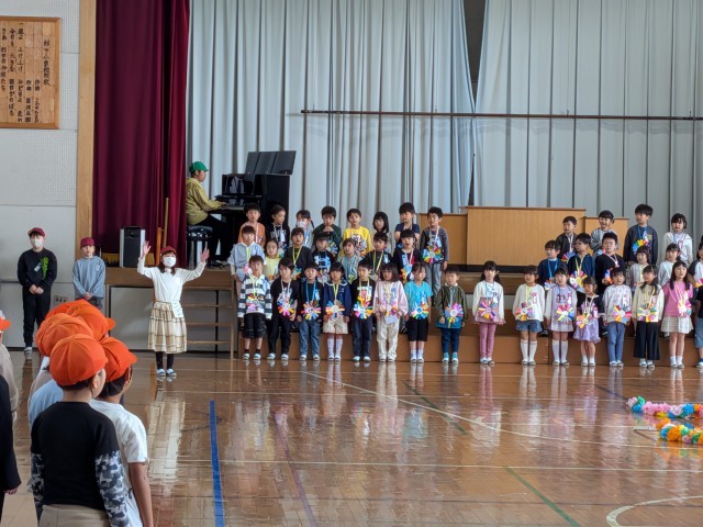 体育館にて、1年生を迎える会を行いました。2~6年生からメッセージや校歌、ペンダントなどのプレゼントが送られました。