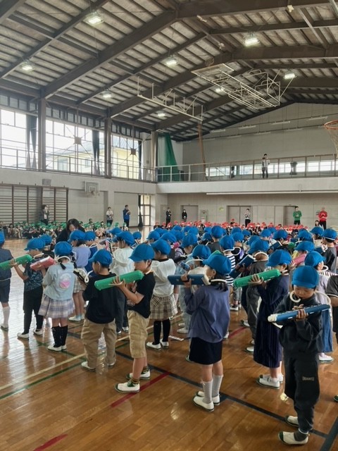 そして、各学年からメッセージを送りました。2年生「いっしょにあそぼうね!」、3年生「なかよくしようね!」、4年生「給食おいしいよ!」、5年生「がんばろうね!」、6年生「なんでもきいてね!」