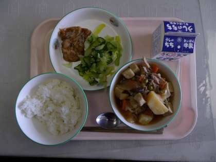 今日の給食は ・ごはん ・肉じゃが ・蒸し鶏のごまだれかけ ・浅漬け でした。エネルギーは677キロカロリーでした。