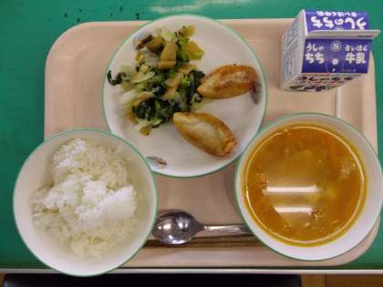今日の給食 公開日 2022/06/06 更新日 2022/06/06 学校日記 今日の給食は ・ごはん ・キムチスープ ・揚げ餃子 ・ごぶ漬け和え ・牛乳 でした。エネルギーは607キロカロリーでした。
