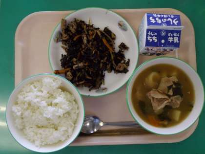 今日の給食は ・ごはん ・鶴茶すいとん ・ひじきご飯の具 ・牛乳 でした。エネルギーは630キロカロリーでした