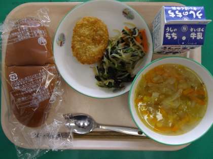 今日の給食 公開日 2022/06/23 更新日 2022/06/23 学校日記 今日の給食は ・黒パン ・キャベツのスープ ・野菜コロッケ ・春雨サラダ ・牛乳 でした。エネルギーは643キロカロリーでした。