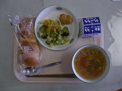 今日の給食 公開日 2022/07/08 更新日 2022/07/08 学校日記 今日の給食は ・ツイストパン ・トマトとレタスのスープ ・チキンナゲット ・ブロッコリーのサラダ ・牛乳 でした。エネルギーは571キロカロリーでした。