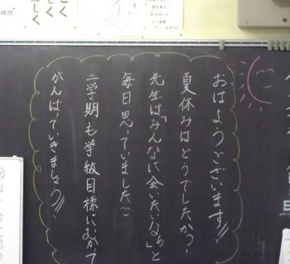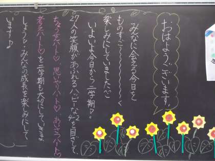 本日より二学期が始まります。教室には様々なメッセージが用意され、子どもたちを迎えました。充溢した二学期となるよう健康に注意しながら頑張っていきましょう。