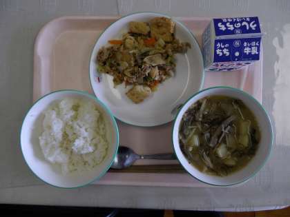 今日の給食 公開日 2022/09/01 更新日 2022/09/01 学校日記 今日の給食は ・ごはん ・もずくのみそ汁 ・豚肉と生揚げのチャンプルー ・牛乳 でした。エネルギーは615キロカロリーでした。