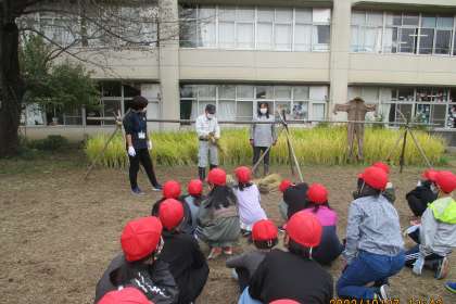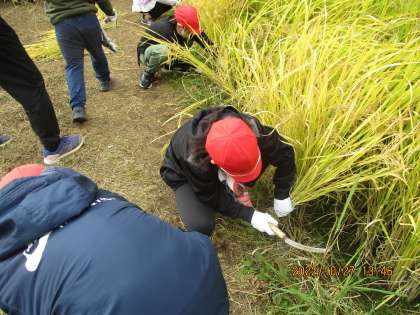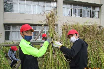 27日に5年生が学校で育てていた稲を刈り入れました。鎌を用いて、手作業で行いまいました。どの子も初めての経験だったと思います。最初はこわごわでしたが、だんだんと上手にできるようになりました。稲を干す作業もなかなかでした。よい経験ができました。