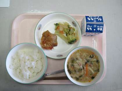 今日の給食は ・ごはん ・みそワンタンスープ ・鶏肉のスタミナ焼き ・ブロッコリーのおろし和え ・牛乳 でした。