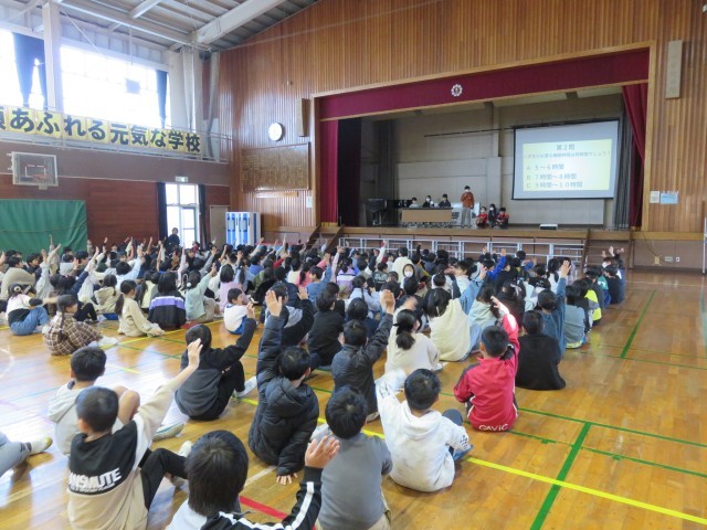 今朝の児童朝会は保健委員会の発表でした。睡眠についてのクイズやアンケート結果の報告などが主な内容でした。全校児童がクイズにも楽しく参加しました。「睡眠時間が足らないとどんなことが体に起こるでしょう?」A 頭が痛くなる B イライラする C 授業に集中できなくなる 「答えは全部です」という問題もありました。3枚目の写真からもわかるように、長久保小の児童の4人に1人が睡眠不足だと感じているそうです。体の成長のためにも、学力を身に付けるためにも、心が安定するためにも睡眠はとても大事だということがよくわかりました。